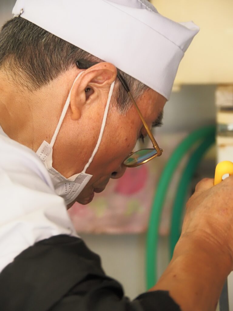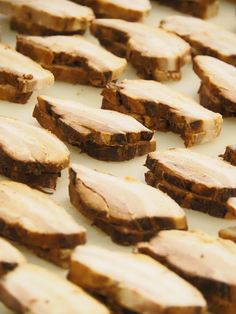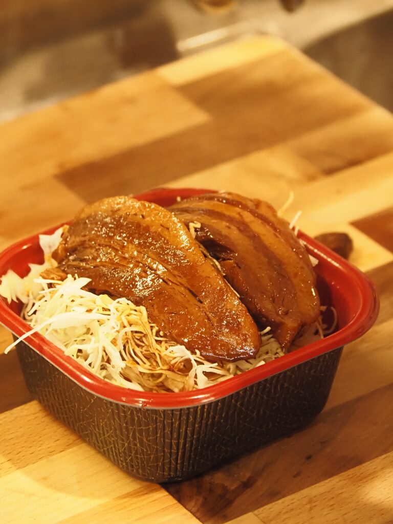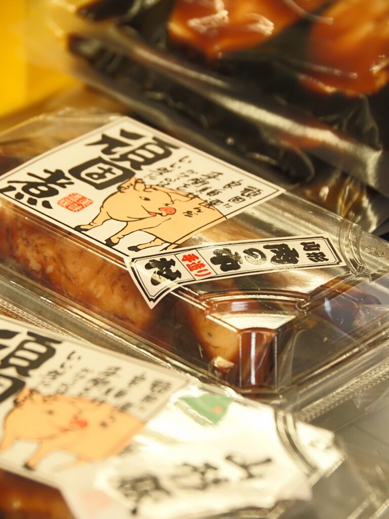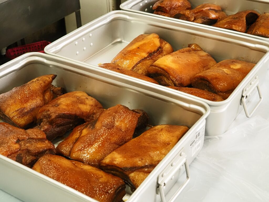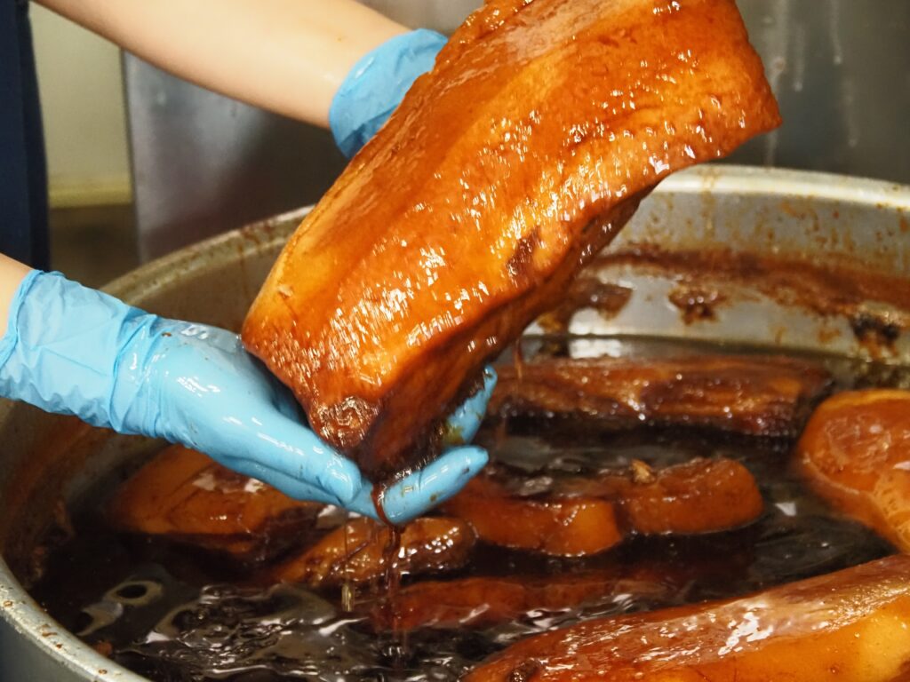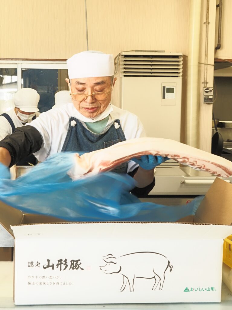 120人分もの頑固煮が次々とケースに積み上げられ、愛嬌のある豚の温かみのあるラベル規則正しく並んでいく。ひとしきり作業が落ち着くと「どうです?冷めてても全然美味しいですよ。」と舟山チーフが卸したての角煮を皿に盛り付けてくれる。思っていた以上に味がしょんでいて、肉厚なのに柔らかい。それに脂が甘い!これを聞いてにっこりした舟山チーフは「山形豚の旨み、最大限に活きてるでしょう?」