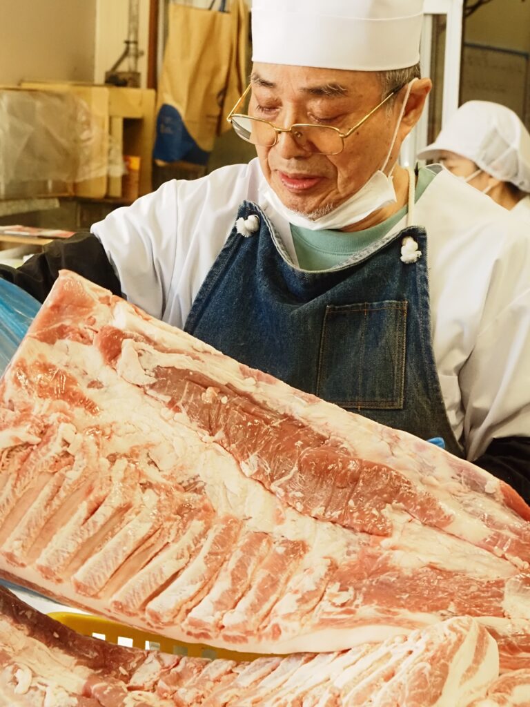 カメラの向こう、手際よく豚肉を切り分けるのは調理場のチーフを任せている舟山さん。前述の中村精肉店が運営していた焼肉店「赤富士」があった頃から腕を振るっている、いわば職人である。