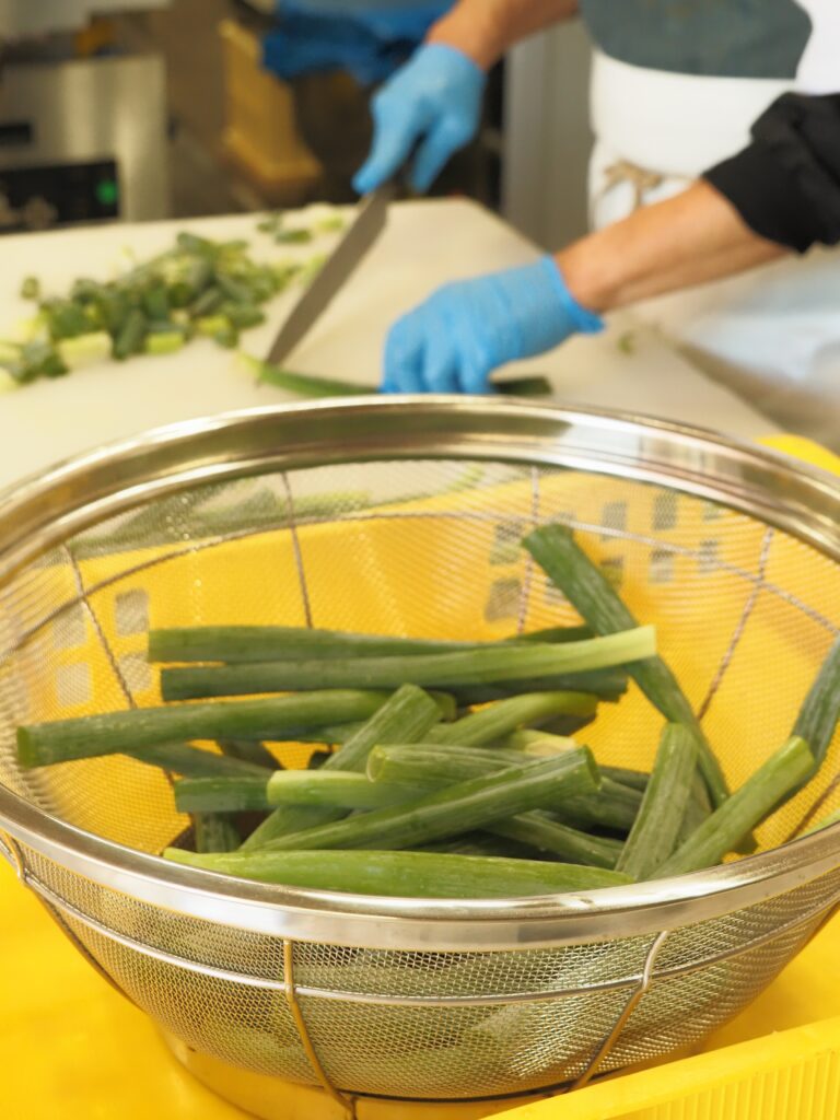 バラ肉の次はネギを。包丁がまな板を叩く音が静かに響く。カットを終えた食材は寸胴へ。「そこに生姜と蜂蜜を加えて2時間火を入れます。」と舟山チーフ。ネギと生姜は豚肉の匂い消しに、蜂蜜は下味を整えるばかりでなく豚肉に自然な甘みを与えてくれるそう。