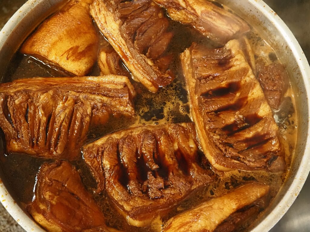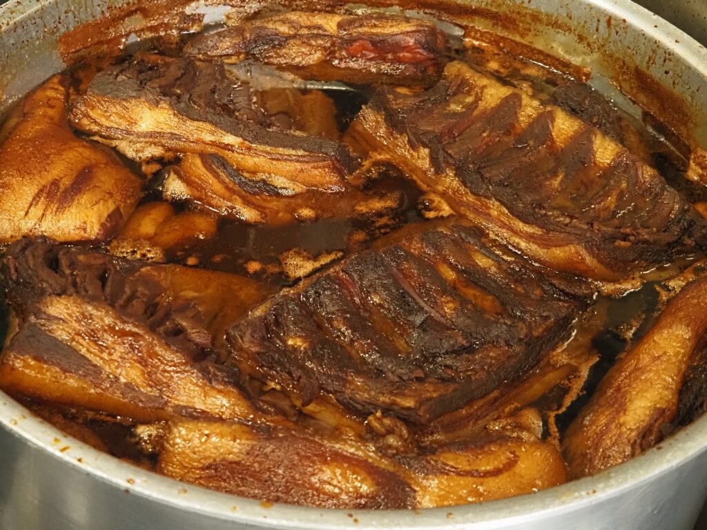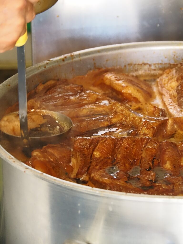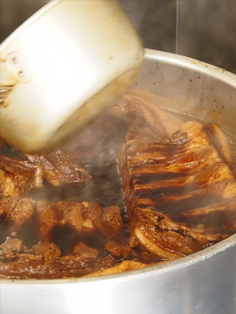 翌朝、再び調理場へ赴く。早速寸胴の蓋をあけてもらうと昨日よりも濃く、引き締まったお肉が姿をみせた。「そう見えるのは、余分な油が溶け切って身の縮みが進んだからですね。」と中村さん。