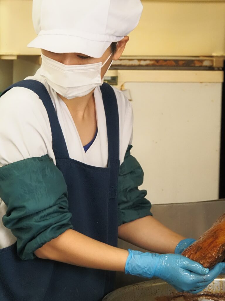 聞けば今がいちばん柔らかい状態だという。そのため寸胴からお肉を取り出す作業 -釜揚げと呼ばれる- には慎重を期さねばならず、担当する渡辺さんは赤ちゃんを抱くように優しく、かつ手早い作業でバットへ移し替えていた。