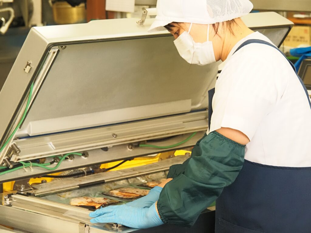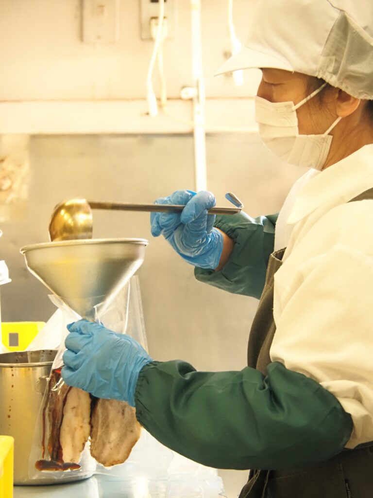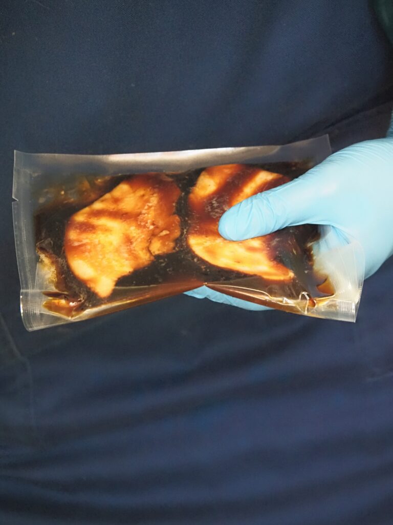 チーフが商品サイズに均等に切り分けたお肉を後の2人が袋詰めし、タレをかけてパッキング。そして商品用のパックへ封入していく。淀みなく作業を進める3人の連携を私はただただ見届けるのみ!